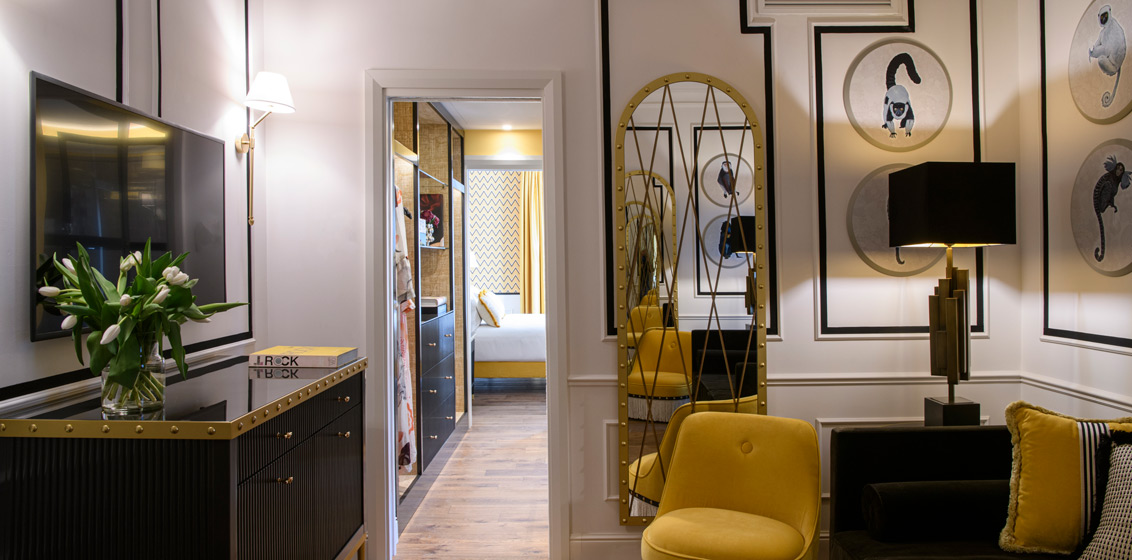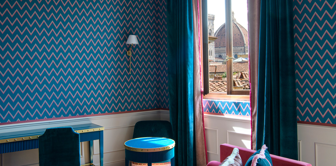 Each of the hotel’s five floors offers a distinct colour scheme as a nod to the Renaissance period, embodying the city’s rich history and artistic magnificence by incorporating distinct regal and bold gem colours including vibrant teals, deep blues, sunny yellows, energetic vermillion and soft greys. The wallpaper was custom designed and lush fabrics including silk, rich velvet and wool were used for the furnishings.