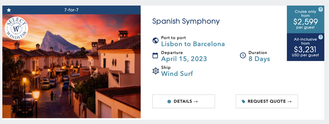 “We thought about only offering the all-inclusive fare on the newly transformed Star Plus Class yachts. But after talking and listening to our repeat guests and valued travel advisors, we found some like to go à la carte and only purchase amenities as they go. After discussing internally, we all came to the same conclusion – why not offer both on all our yachts? We offer a choice between sailing yachts and all-suite yachts, and now a la carte or all-inclusive. That seems to fit the Windstar brand,” Prelog remarked.The new pricing is already live on Windstar’s website, with the below example of the 8-day Spanish Symphony itinerary showing the cost difference of $632 (per person twin share) between an all-inclusive ‘bundled’ fare and traditional cruise-only fare.