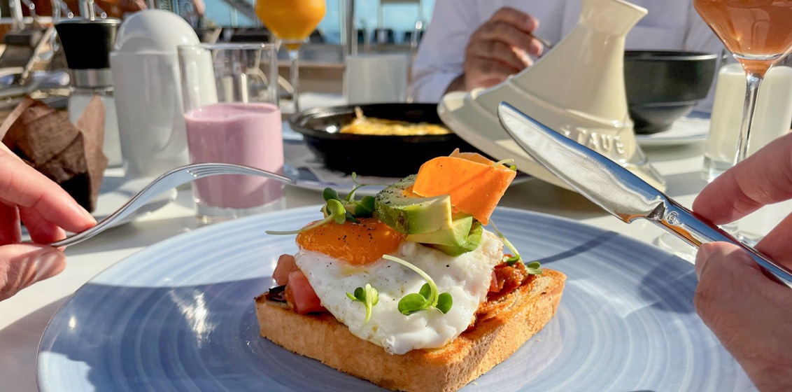 “It’s a lovely new option. When I was on board, just sitting there having a coffee, grabbing a little bite to eat – something that we call the ‘Super Bowl’: quinoa, avocado, peppers – it’s absolutely delicious! – it gets the day started in the right way.”Seabourn’s ‘club bites’ have also been revamped. There’s a selection of canapes that change daily, such as savoury-filled macarons to caviar in cones, that are available in the Club lounge which provides both indoor and outdoor seating, overlooking the stern of the ship.