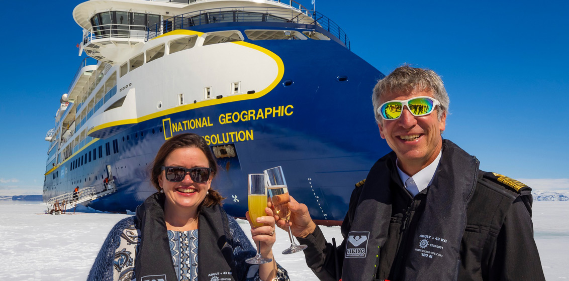 Under Antarctica’s clear blue skies and parked on fast ice in the Weddell Sea’s Duse Bay, guests walked onto the ice to cheer on Captain Heidi Norling as she christened the 126-guest National Geographic Resolution.