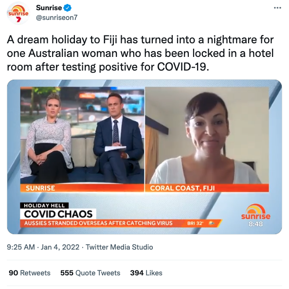 Jacqueline Hoy told Channel Seven’s Sunrise her family holiday to Fiji had been an “absolute nightmare” having been placed in self-isolation for 10-days after contracting COVID within days of arriving at The Naviti.