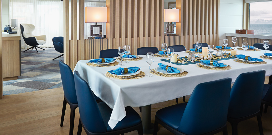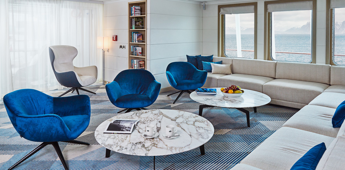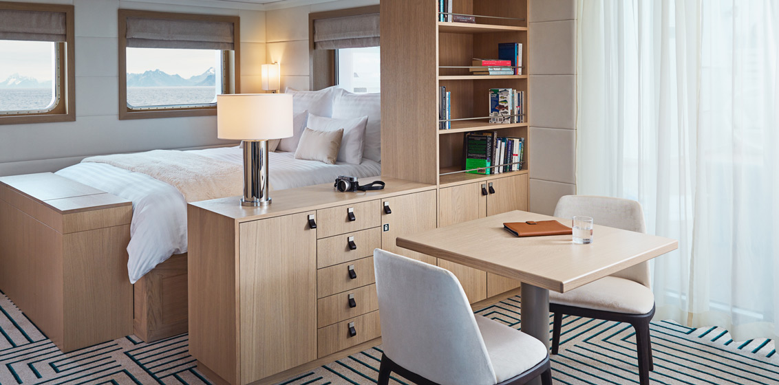Following a multimillion-dollar redesign by Partnership Design and AROS Marine, the seven-cabin Hanse Explorer features a rugged, steel-hulled exterior, with the highest commercial ice classification, and a newly refined interior with a distinctly modern style. With an indoor-outdoor design that embraces its oceanic surroundings, traditional dark paneling and leather furnishings have been swapped for light woods and a neutral palette of creams, clean whites, and chromed silvers, complemented with nautical navy blue touches. Expanses of glass sliding doors flood spaces with light to allow for optimal viewing of wildlife during expeditions, and cabana-style Bali beds were added with the opportunity to sleep under the stars.