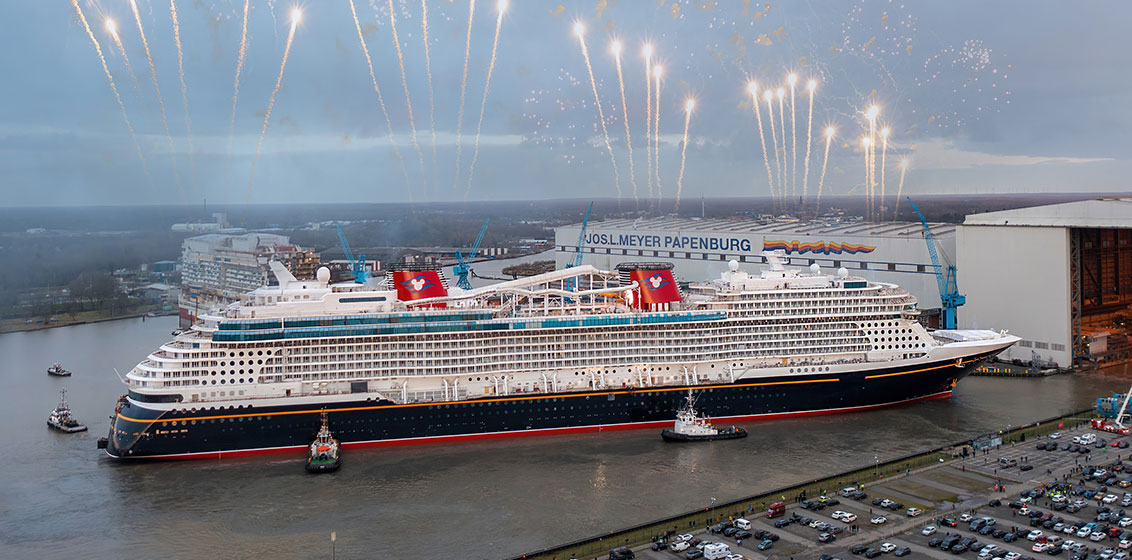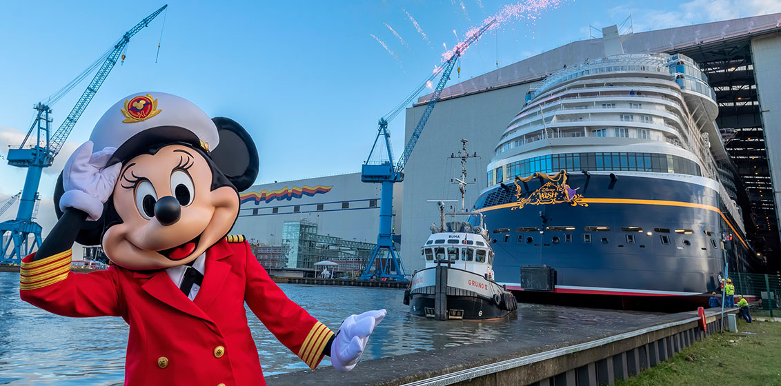 Marking the world’s first look at the newest Disney ship, the major construction milestone was celebrated in true Disney style with fireworks, musical fanfare and an appearance by Captain Minnie Mouse.