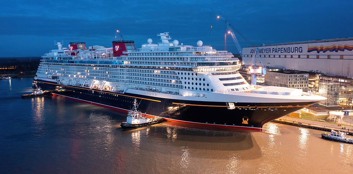 Disney Wish is the first of three new Disney Cruise Line ships to be built at the Meyer Werft shipyard through 2025. Each will be powered by liquefied natural gas (LNG) and weigh approximately 144,000 gross tons.