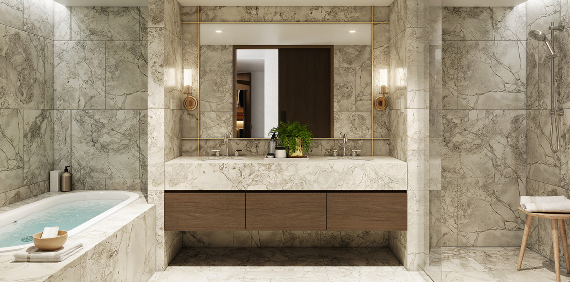 Within the dressing, bathing and refreshing area of the guest rooms, bathrooms are luxurious oases lined in warm grey marble and each has an oval bathtub, double vanity and a walk-in rainshower. The dressing area features superbly crafted wardrobes.