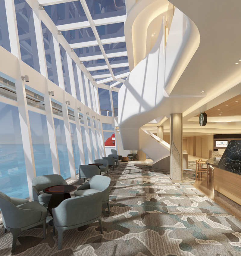 Designed by Miami-based Studio Dado to evoke the sense of wonder felt by the ocean’s earliest explorers, NCL’s first three-story, glass-walled Penrose Atrium spanning decks six, seven and eight will be one of the focal points on Norwegian Prima and Viva. The grand space will vaunt futuristic architecture including a large-scale chandelier custom built by the renowned Czech lighting design firm Lasvit.