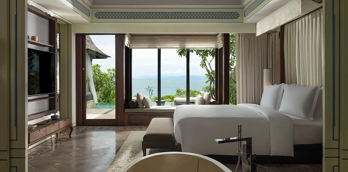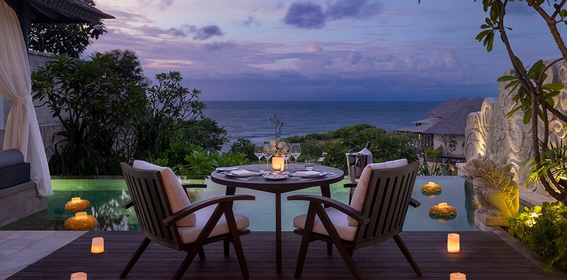 Boasting spacious villas perched atop the limestone cliffs, the resort offers 123 villas in one- and two-bedroom configurations, as well as a four-bedroom Royal Water Palace, all featuring sublime tropical views of the Indian Ocean and lush green natural beauty of Bali. Each villa features a private pool and outdoor living area with an open pavilion overlooking the sunset horizon or a landscaped tropical garden. The resort also provides guests with exclusive access to a private beach framed by the natural landscape offering a secluded enclave to relax.