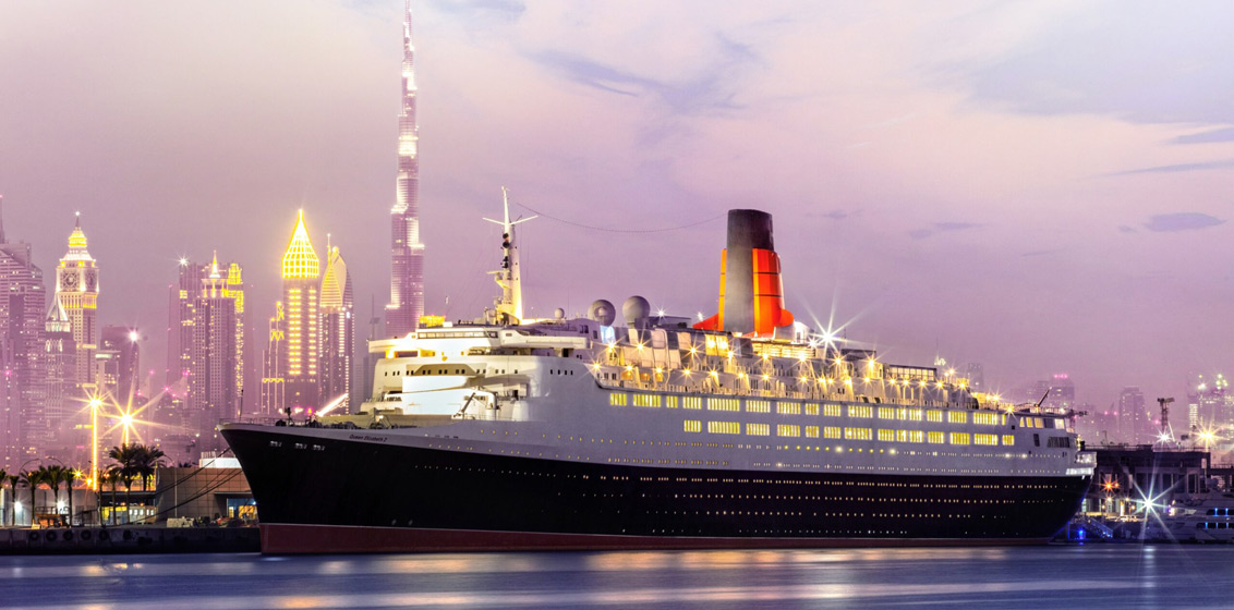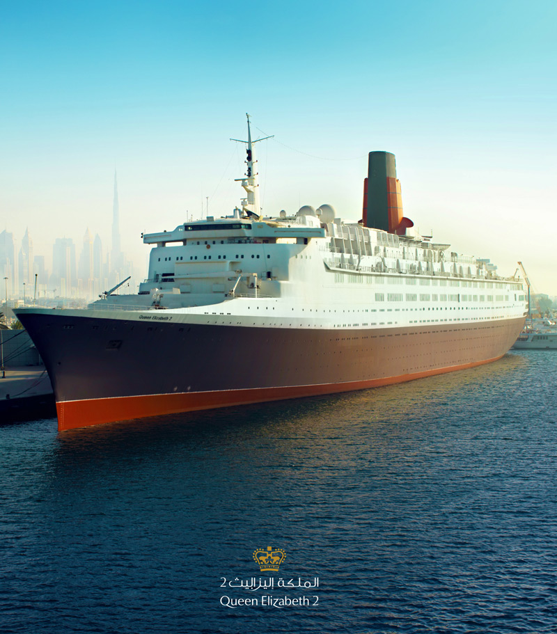 Situated in Dubai’s Port Rashid, the QE2’s location is in close proximity to Sheikh Zayed Road, providing easy connection to every main attraction the city has to offer. Dubai Mall, Burj Khalifa and La Mer Beach are all located less than 20 minutes away, while the Palm Jumeirah and Mall of the Emirates are located 35 and 29 minutes, respectively.