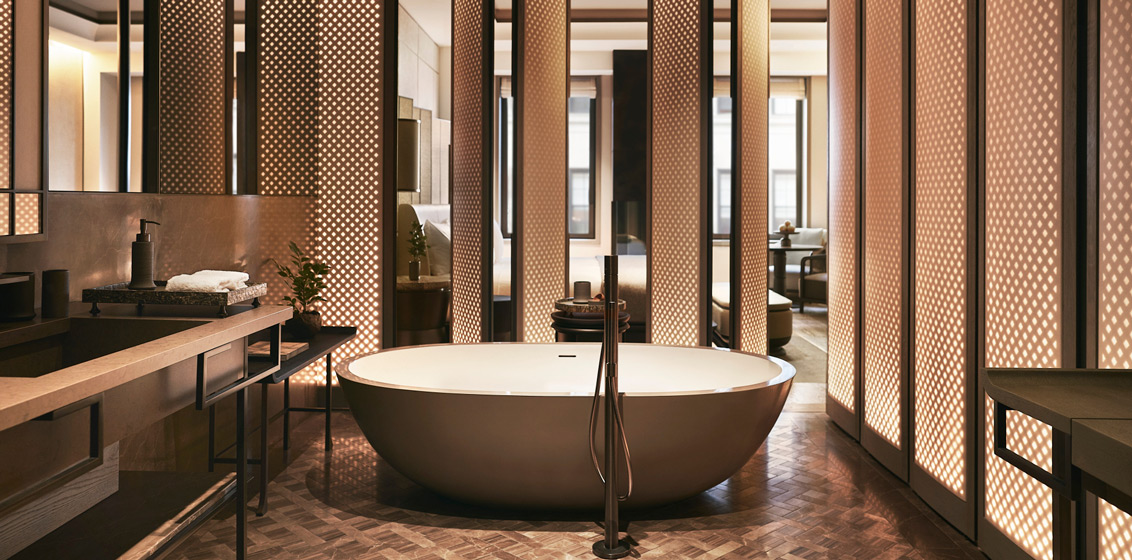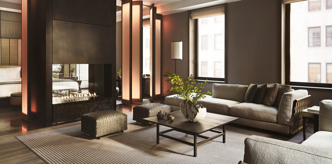 Pitched as “ideal for business or leisure guests alike”, the hotel’s 83 suites are among New York’s largest and are inspired by the airy architecture of Aman’s properties in Southeast Asia. Every suite offers a functioning fireplace, a first in New York City, while bathrooms are opulent and oversized with oval soaking bathtubs, marble rain showers and double vanities. Large windows offer dynamic views, and the use of organic, natural materials and muted tones brings a sense of balance and harmony reminiscent of that found in Aman resorts of the East.