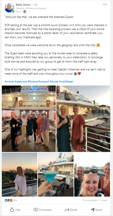 “They were onboard Azamara Quest in the Caribbean following a sales meeting in Miami, demonstrating to travel agents and loyalty partners how cruising is safe, it’s easy, and how we can get out there.