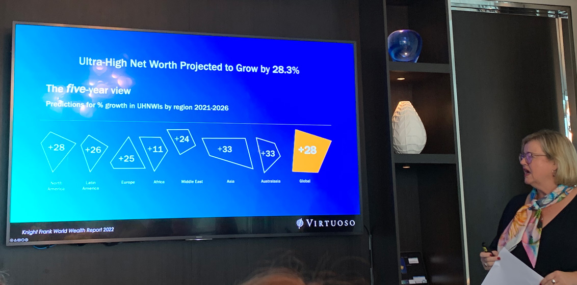According to a five-year forecast by Knight Frank World Wealth Report 2022 the percentage growth in ultra-high net worth individuals is projected to rise by 28.3% globally, with Australasia and Asia the highest regions for growth at 33% each, ahead of North America (28%), Latin America (26%), Europe (25%), Middle East (24%) and Africa (11%).