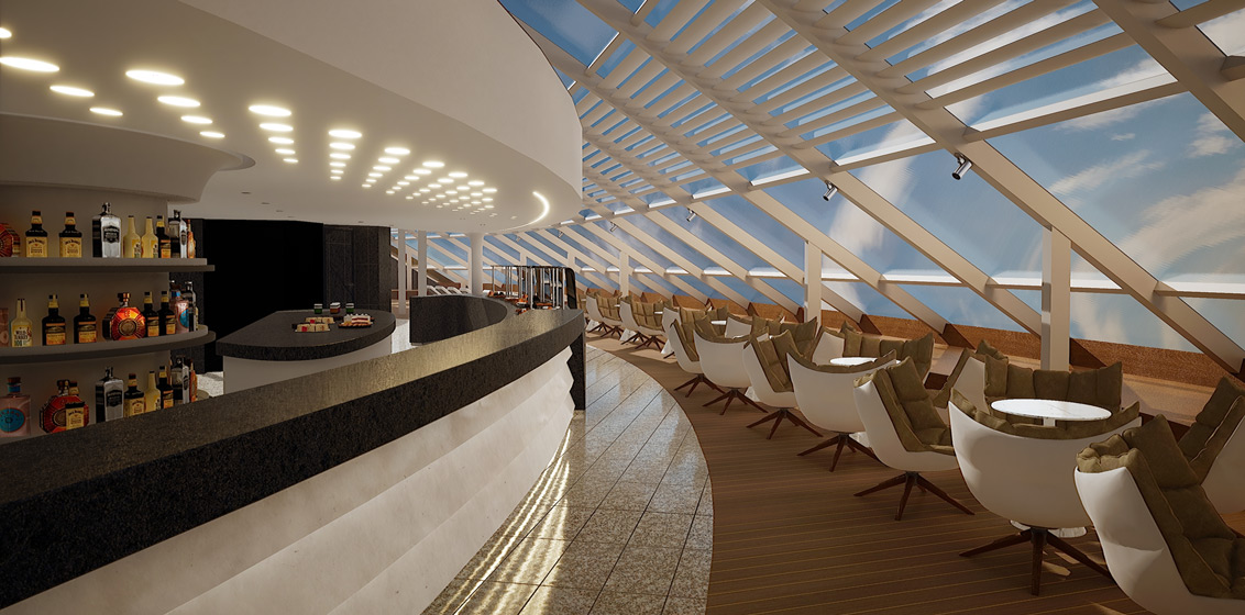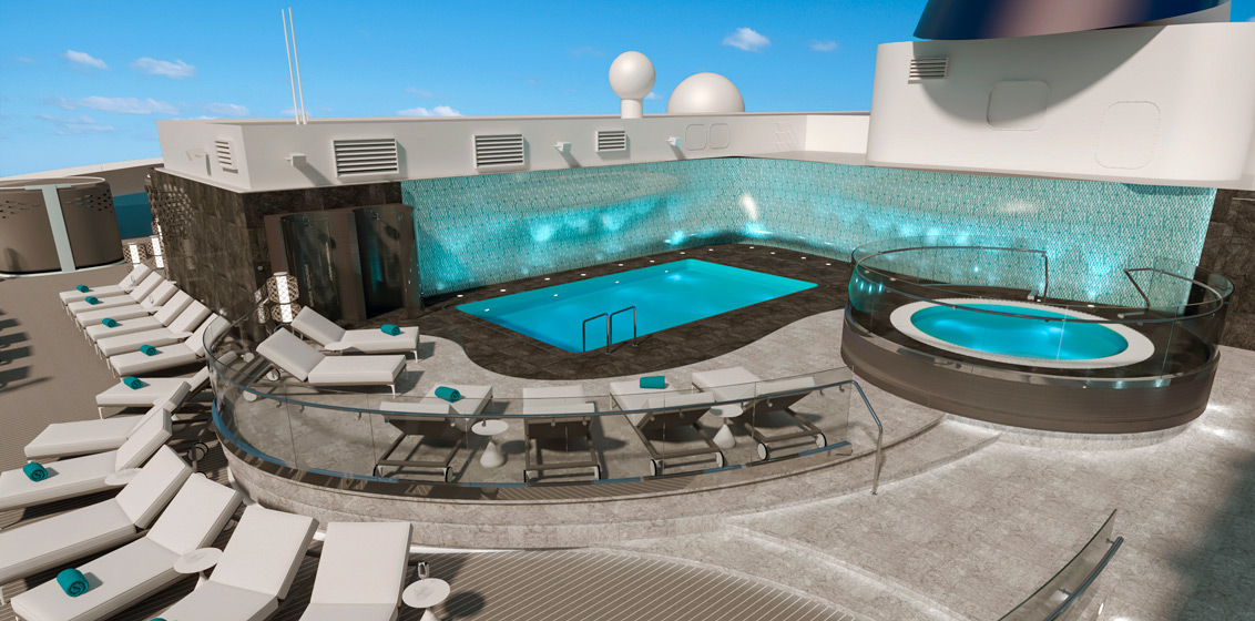 A totally reimagined sundeck – spanning two decks, guests have plenty of space to enjoy the sea views from the front of the ship. The lower deck allows guests to unwind and sip a glass of champagne from the bar or a bite to eat from the grill whilst the upper deck is home to a private pool and whirlpool where guests can take in the sun on comfortable loungers or one of the stylish private cabanas.