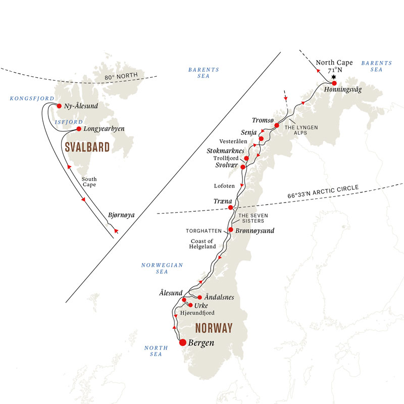 - 10-day Northbound (Bergen to Longyearbyen) or Southbound (Longyearbyen to Bergen), AU$5,751 per person;