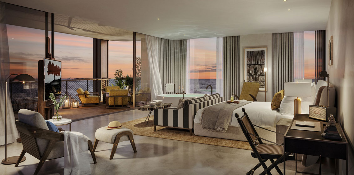 The ten-bedroom Pinnacle boasts 858 square metres of interior living space and 655 square metres of private outdoor space. It welcomes guests through a private entrance opening onto a Mediterranean-style courtyard and staircase leading to its main living floor. Besides a large open-plan kitchen, spacious living area, degustation room, and private pool, the Pinnacle features a cinema and extensive outdoor terraces. The master bedroom opens to a large private terrace with a standalone bathtub taking center stage with views across the bay.