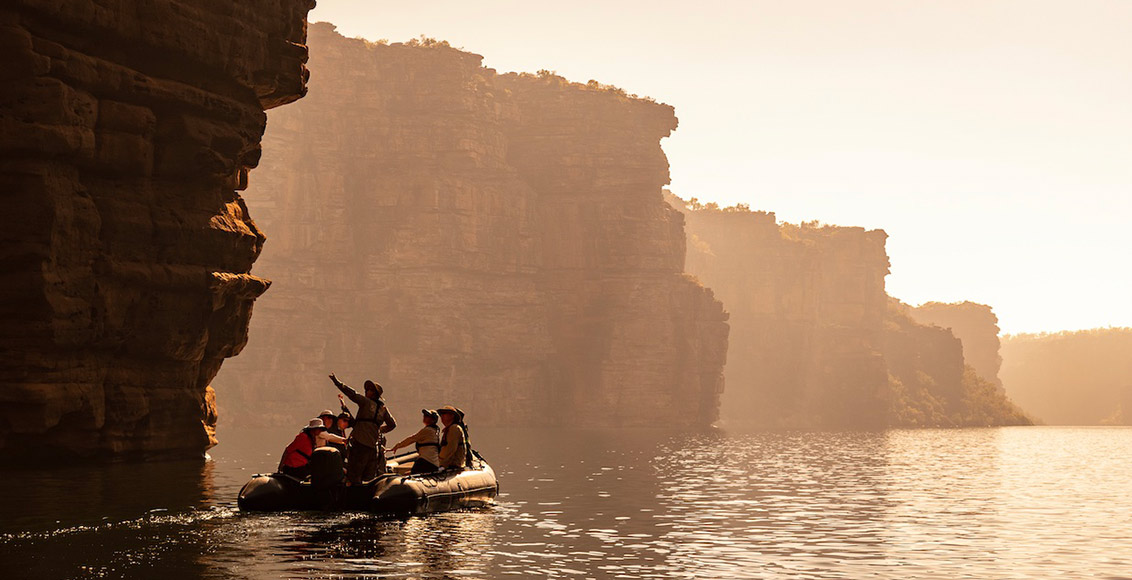 An immersive expedition including exploration of the spectacular 80-metre-high sandstone cliffs of the King George River Gorge and its Twin Falls, the highest in Western Australia, the chance to uncover the stories behind the enigmatic Gwion Gwion rock art and experience Prince Frederick Harbour, one of the largest and most scenic inlets of the Kimberley coast.