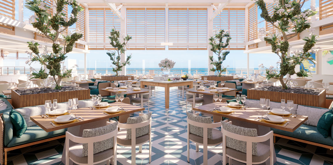 The largest of Silver Nova’s restaurants with a capacity of 340, the 359m2 La Terrazza will comprise both indoor and outdoor spaces on deck four, serving breakfast, lunch, and dinner with open seating. Reimagined with a brand new aesthetic that incorporates a vibrant colour palette, La Terrazza will offer one of the most immersive destination experiences aboard Silver Nova, with floor-to-ceiling windows providing views to the horizon and an expansive terrace for up to 90 diners. The venue will feature a large buffet area during the day, while decorative, fluted glass screens will enclose the space during dinner. Silver Nova’s asymmetrical design has enabled the creation of a new shape for La Terrazza: the venue will have a curved layout on the port side, while running to the ship’s aft on the starboard side.