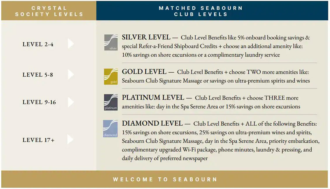 According to a micro page on Seabourn’s website entitled “Welcome to your new home”, all former Crystal Society members “who are now feeling adrift” can have their membership level matched with the equivalent rank in the Seabourn Club.