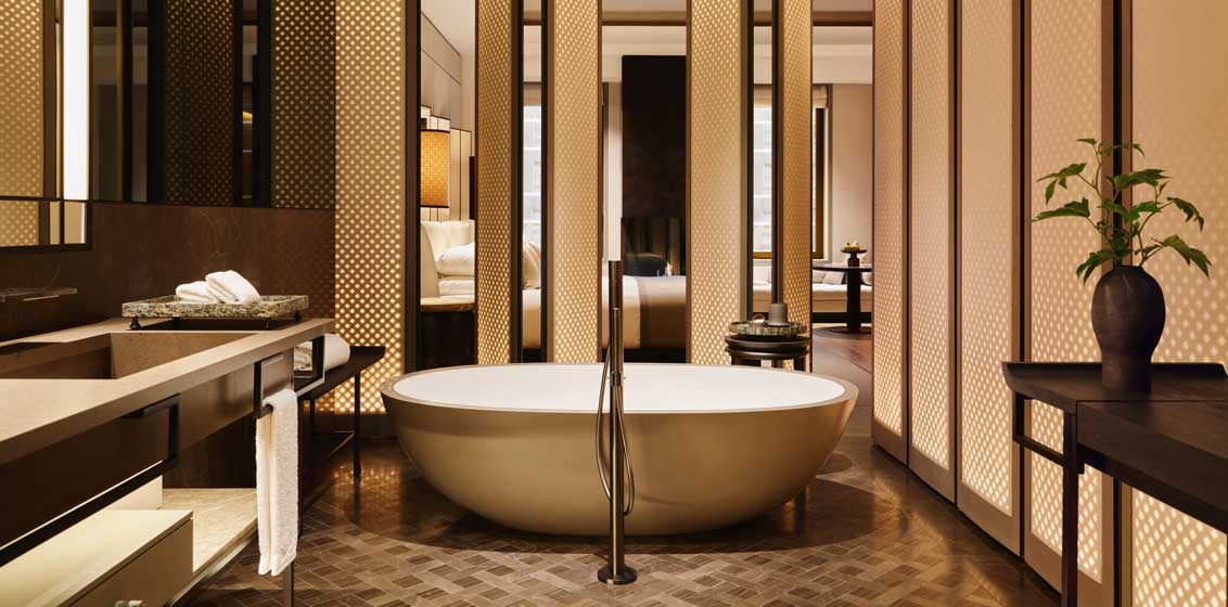 Situated in the historic Crown Building, Aman New York is a temple of design, created in partnership with long-time Aman collaborator Jean-Michel Gathy of Denniston Architects. The arrival experience sets the tone for an aesthetic journey which complements the powerful statement of the building’s gilded splendour. The double-height atrium with multilayers of textured ceiling and wall panels in muted tones hints at the brand’s Asian heritage while celebrating the unceasing heartbeat of Manhattan.The crowning glory of Aman New York is its broad selection of buzzy social venues. Headlining these areas is its verdant 14th-floor wraparound Garden Terrace offering year-round dining, a rarity in one of the most densely populated cities in the world. The Garden Terrace is flanked with water features adding a soft and soothing touch, and fire pits creating a sense of drama and energy.
