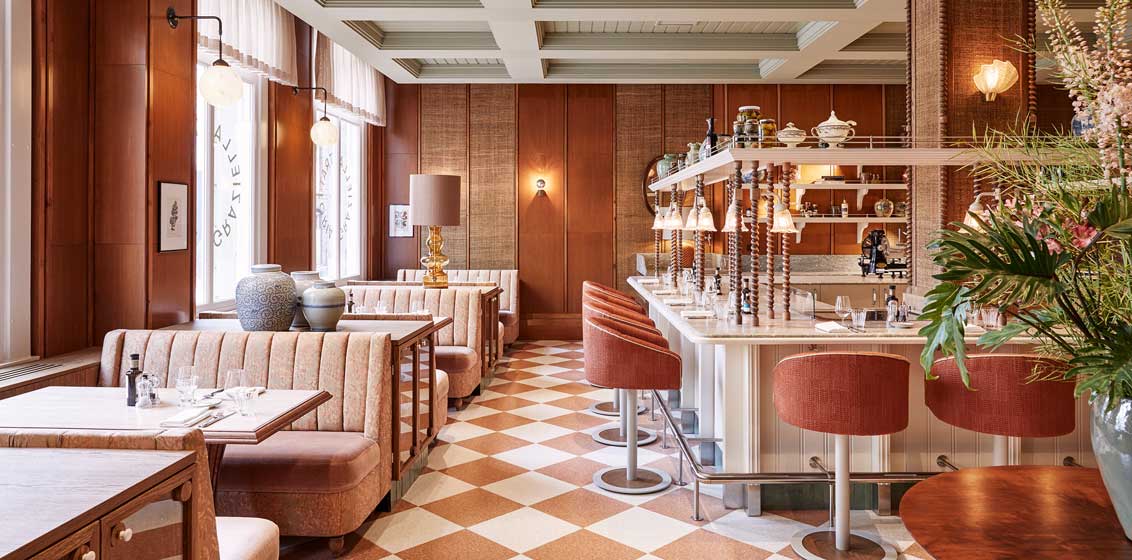 For mostly-plant-based modern Aussie-style cuisine, head to Michelin-starred Flore restaurant (Bas van Kranen’s best-selling vegetables of the day has at least 25 varieties). Its carpet evolves from grey by the entrance to soft mushroom by the window over the water. Its walls are a woodland view that continues around the room. Look up to ceiling-suspended platelet-shaped panels of clouds. For alternative dining, choose one of the ravioli specials in Graziella. Taste gins in Freddy’s Bar. Cruise canals in Hilda, coincidentally also 1896-vintage. Charge whatever, even the Hockney couriered wherever, to your bill.