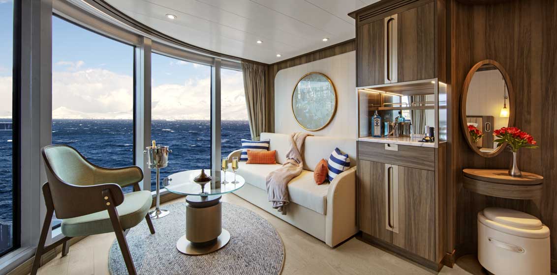 As on every vessel in the Seabourn fleet, the 132 oceanfront suites of Seabourn Venture are defined by thoughtfully crafted furniture, tactile materials, and bespoke details that capture the timeless luxury of travel and elevate the experience. Public spaces throughout the ship have narratives all their own, with tactile and elemental materials employed to evoke ruggedness, the spirit of adventure, and the thrill of discovery balanced with Seabourn-style luxury and comfort.