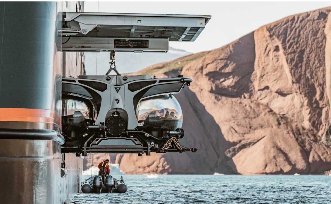 The ship is equipped with kayaks and enough Zodiacs to transport every guest on expeditions at once, as well as two custom-built submarines, each with capacity for six and capability of exploring shipwrecks and natural wonders under the sea in luxurious comfort.