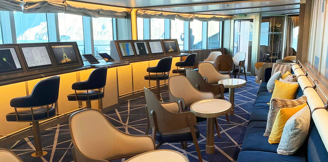 - The Bow Lounge on Deck 6 provides the closest access to the water via the foredeck, making it a prime destination to watch for marine life. Comfortable and engaging, the lounge is designed to mimic elements of the Captain’s bridge, with expansive windows and interactive monitors displaying updated information about the day at sea. Large screens project live footage from a drone outside, and smaller touch screens offer a live map, weather information and more.