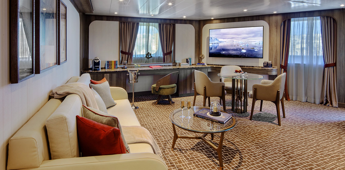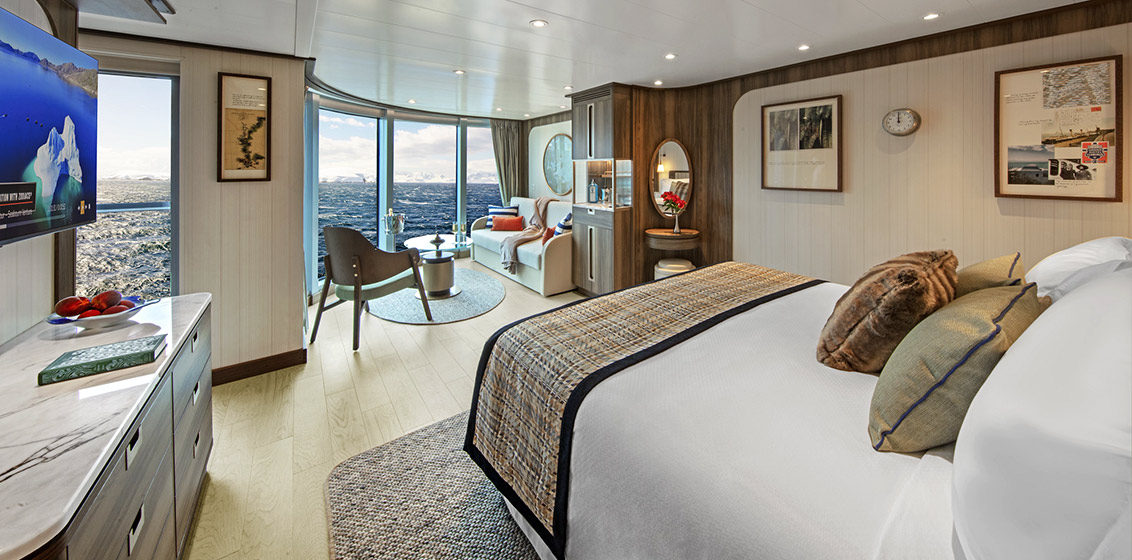 A new for Seabourn suite category featuring a semi-circular living area with comfortable seating and expansive floor-to-ceiling windows providing guests a spectacular perspective of the world outside including sweeping views from their suite. A queen-sized bed or twin beds are also oriented to face the windows, allowing guests to enjoy views of beautiful scenery and gorgeous sunrises and sunsets.
