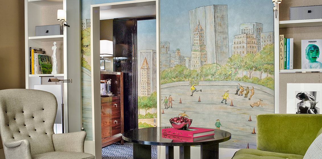 Suite 3101, designed by Tony Chi, does seem like a private apartment. Patterned carpets and tiled floors, and soft greens echo the colours of Central Park, two blocks west. The full working kitchen, and vases of off-white flowers, are at-home feeling. Lots of real art books complement a trompe l’oeil of taupe books on the white wall above the deep soaking tub.