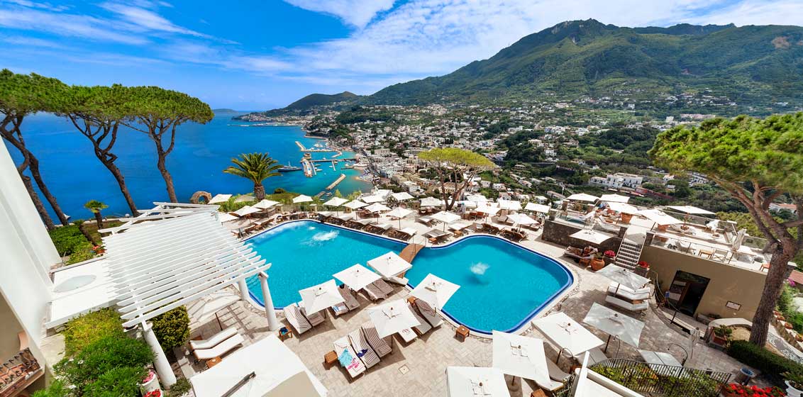 San Montano Resort & Spa Ischia is an exclusive spa resort with spectacular views of the sea. Located in a secluded part of a rugged outcrop overlooking the Neapolitan Coast, this serene hideaway has stunning Ischia and Naples views. The resort has 65 rooms, 2 restaurants and 7 Swimming pools, both Thermal and Sea Water.