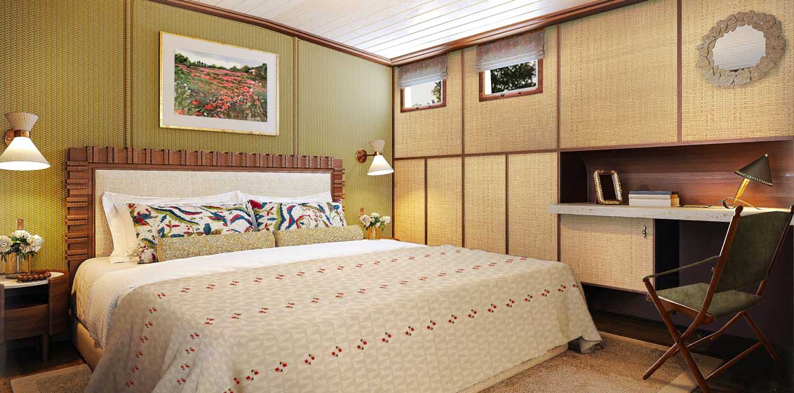 Launching in May 2023, Coquelicot will operate on the canals of Champagne. Featuring three cabins with ensuite facilities, an indoor salon and lounge for dining and relaxing, with a champagne bar and extensive outdoor deck, “Coquelicot will set a new standard of sophistication for slow-paced sailing in France,” Belmond says.
