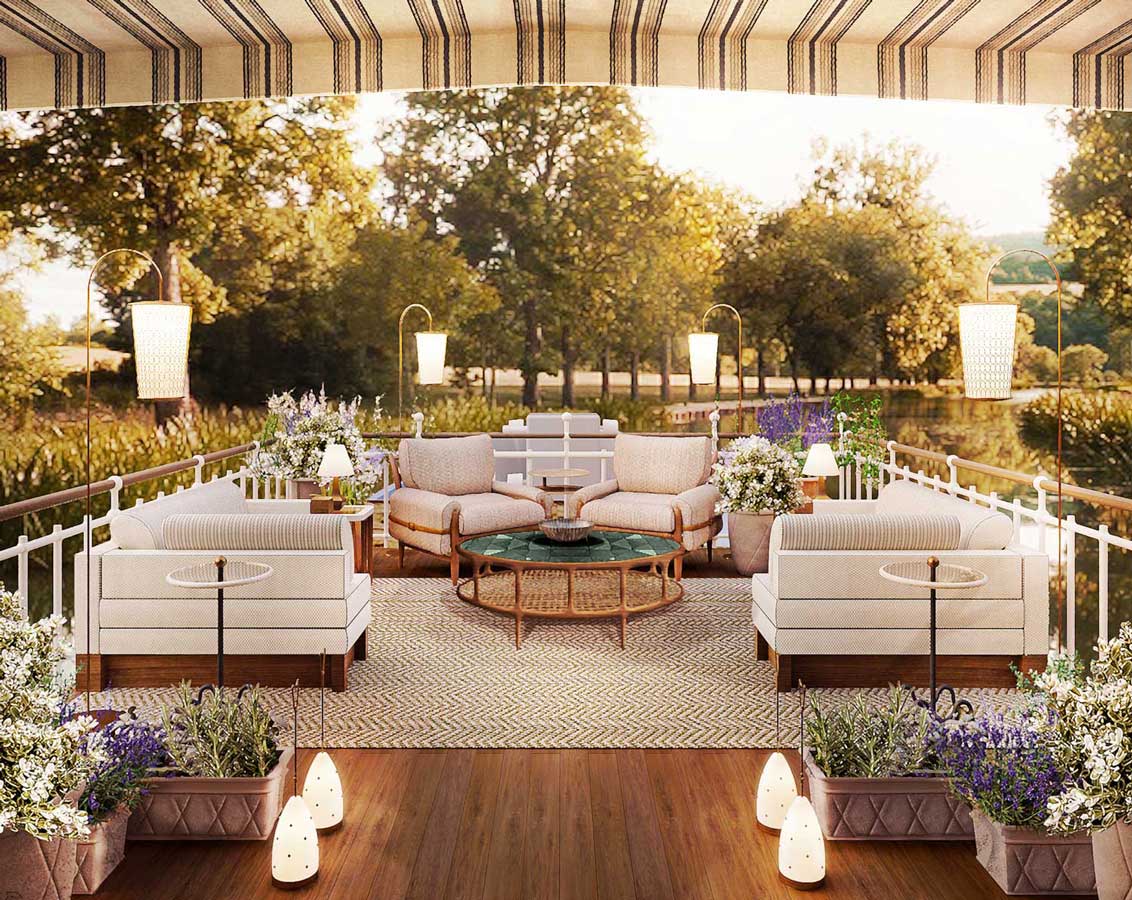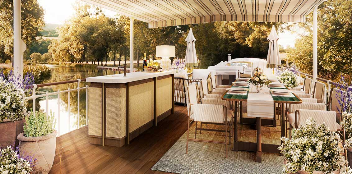 The vessel’s top deck will be the jewel in the crown: two seating lounges, an open kitchen and a shaded dining area will offer a choice of spaces for guests to unwind and laze around as they meander the calm waterways.