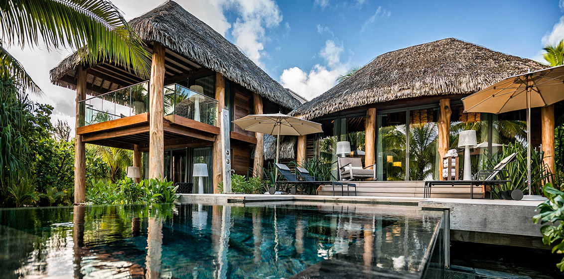 Onetahi is the atoll’s only inhabited island, and here you have the airstrip, the all-inclusive 38-villa resort and a village to house the 230 team members. From the guest viewpoint, the overall picture is superlative. For a start, all pools are so obviously private you can swim 24/7 free of cossies or even budgie-smugglers. Wake up with the sun, cross a three-metre deck, down five multi-hued crystalline steps to one end of your nine-metre pool. Around is a 360° vista of white sand, green undergrowth and turquoise lagoon (blue ocean beyond the white reef, 400 metres out).With the exception of three-bedroom #103, and a two-floor four-bedroom Residence with a superb kitchen and indoor and outdoor dining for eight, villas are identical. Number 203, for instance, is approached past two numbered city bikes and along a 25m walkway. The villa’s eight metres deep, its 25m width divided into three. Compressed bamboo floors and rattan-look or cream walls rise to an open-rush high-point ceiling. The left-hand space is a media room and office. The central living room leads through French windows, to the deck. The right-hand space is sleeping, changing and abluting, with an outdoor soaking tub. Internet, by the way, is world-class, no password needed.