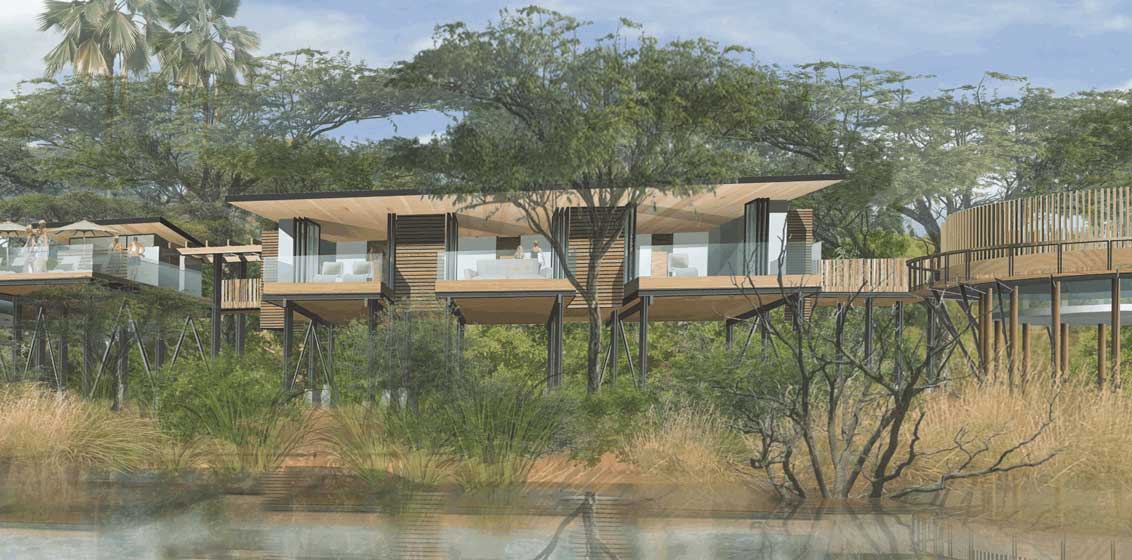 The lodge will sit on a series of stilted wooden structures to provide the lightest possible footprint while still being capable of withstanding a heavy knock from a passing elephant. Fabricated off-site to minimize construction impacts, the arrangement of lodges and villas will be connected by raised walkways and bridges.