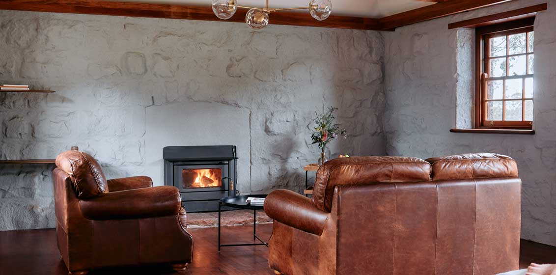 Elegant furnishings emphasise the raw beauty of the original bluestone walls, with a palette of warm earthy tones, natural textiles and rich timbers accentuating its connection to the outside world. In cooler months, the fireplace is central to the room experience, while summer months draw guests out to an expansive private courtyard, enclosed by nature and overseen by the eternal presence of Wugarri (Mount Sturgeon).