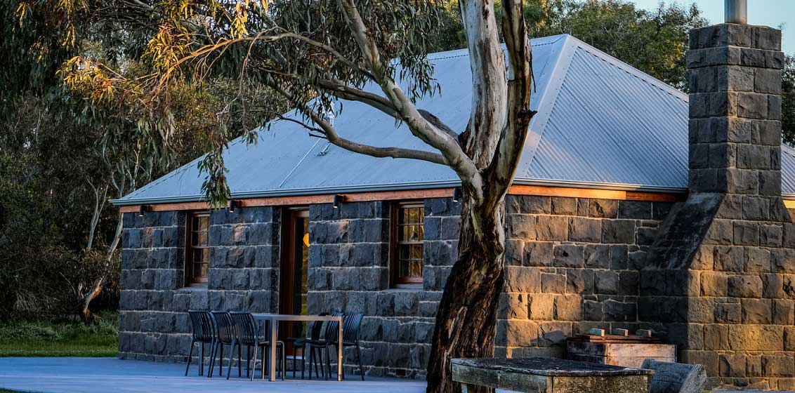 Retaining the integrity of the 1850s bluestone structures, Byrne Architects’ refurbishment pays homage to the cottages’ origins as shearers’ quarters, emulating the design language of Western Victorian woolsheds with touches of luxury.