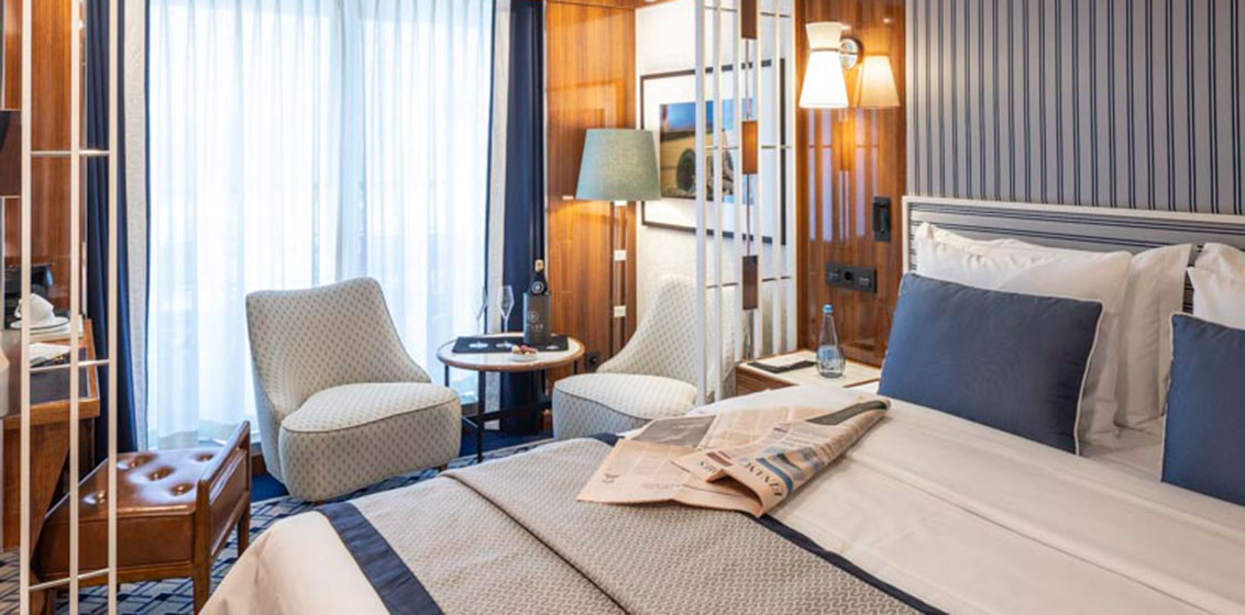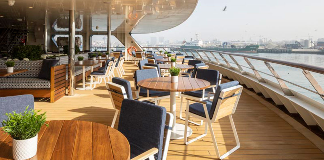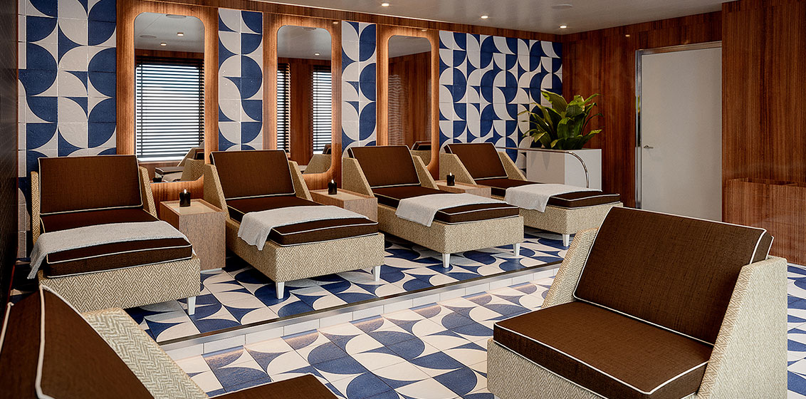 From rich, blue and white fabrics to sumptuous, custom-made furnishings with hints of terracotta, green and slate, the ship’s décor is warm and inviting, yet sophisticated and stylish.