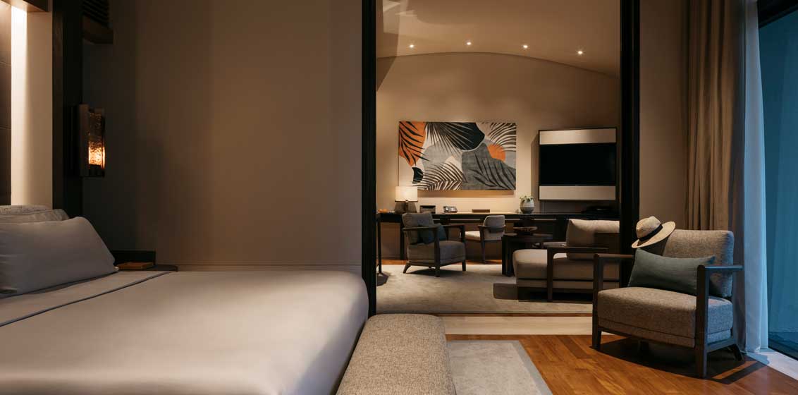 Spectacular exteriors pair with soothing interiors by Hong Kong’s designer-for-the-intelligentsia, André Fu. His colour palette for bedrooms’ furnishings seems to mirror the lush greenery outside. Rooms have daybeds on their outside terraces, cut into the main building, for even more commune with nature.