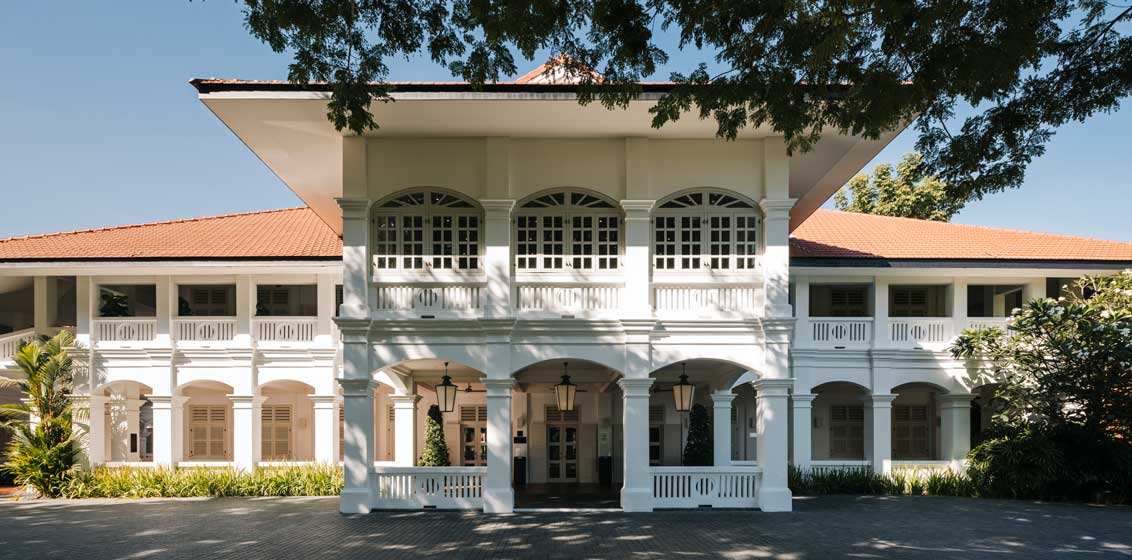 A bit of history helps. The 110-room hotel is a conversion of WWII officers’ quarters on a low hilltop on 30 acres of gorgeous sculpture-dotted tropical parkland on Sentosa Island, only ten minutes by car from Singapore’s financial district. The conversion was enhanced by Sir Norman Foster’s addition of dull tomato-coloured railings bordering new construction that wraps from one end of the original two-floor building to the other end, the whole forming one large kidney shape.