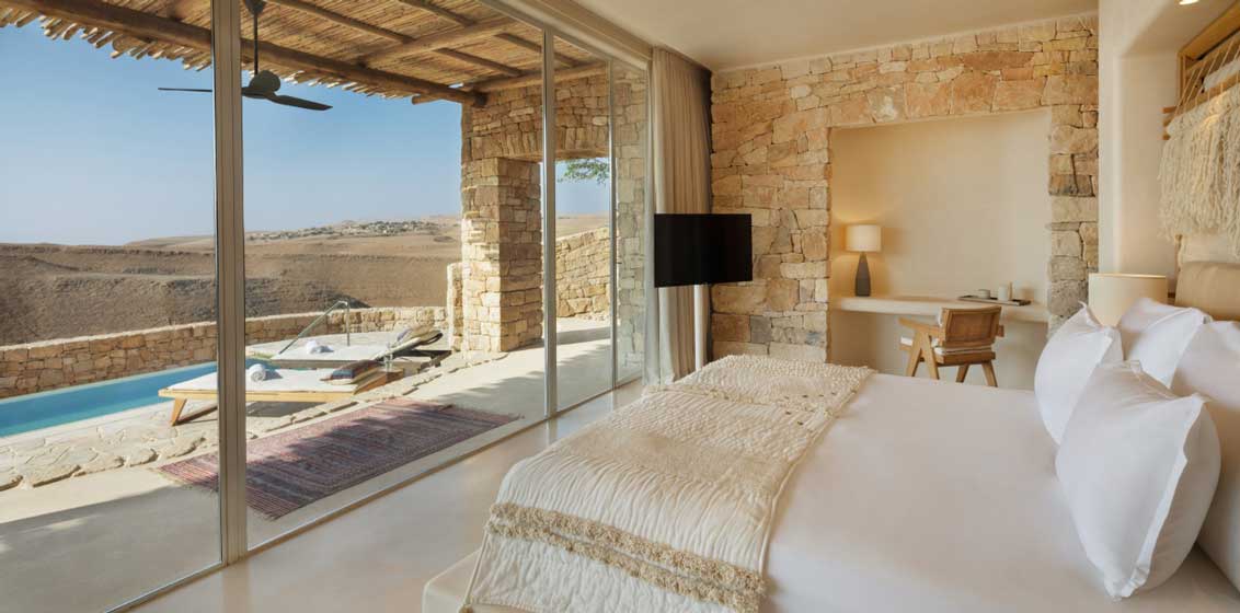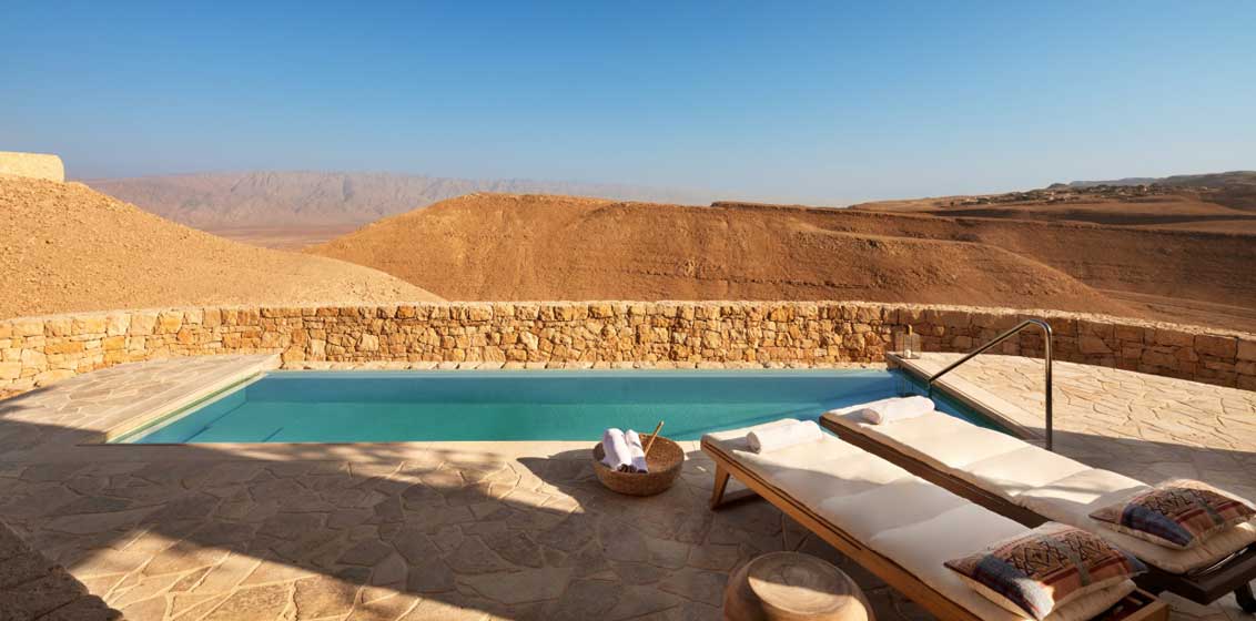 Israel’s Negev Desert might not be as big as the 348,750 sq km Great Victoria Desert but even at a mere 13,000 sq km it deserves to be taken seriously – as does its premier resort, Six Senses Shaharut. It’s a unique oasis, four hours’ drive south of Tel Aviv. In a 360-degree empty panorama, palest pink with uninterrupted blue sky over. You’re emotionally lost in another world even before you arrive.