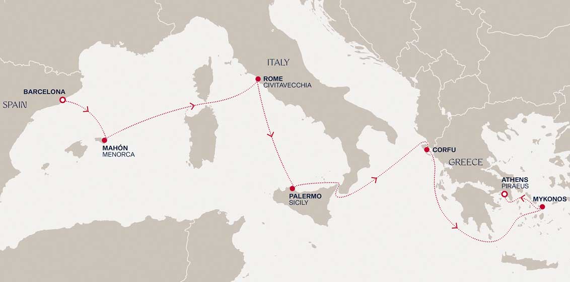 EXPLORA II will first traverse the Mediterranean reaching ports in Italy, Spain, Greece, Cyprus, Israel and Croatia.An incredible array of activities awaits EXPLORA II’s guests who will be able to visit some of the most beautiful cities and islands in the Mediterranean such as the eternal city of Rome, Sicily, Menorca – the gastronomy capital of 2022 – to then reach the Eastern Mediterranean with the islands of Mykonos, Santorini, Kalamata and Corfu, lands of mythical gods, architecture, food and ancient culture.