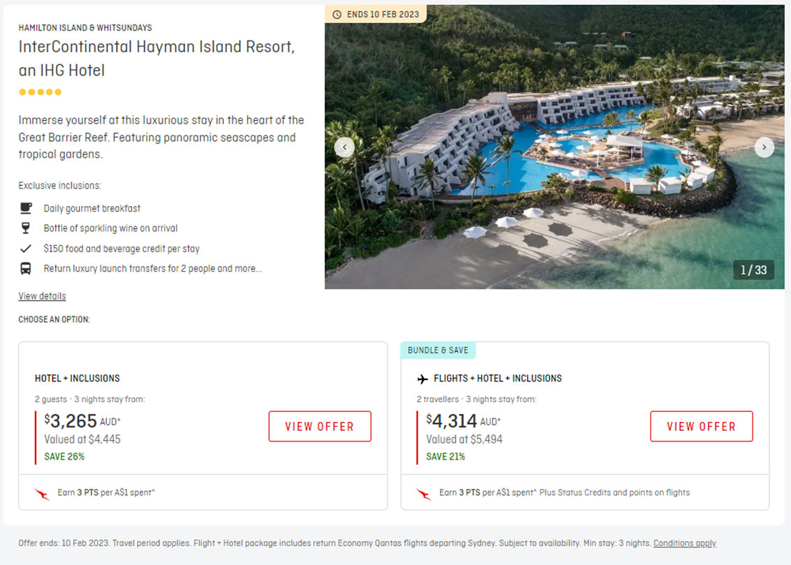 “Our holiday experts have negotiated exclusive inclusions… with our best hotel partners, just for you. Each offer is available for a limited time only and in most cases, can be combined with Qantas flights to create the ulitmate luxury holiday package,” the Qantas magazine states.