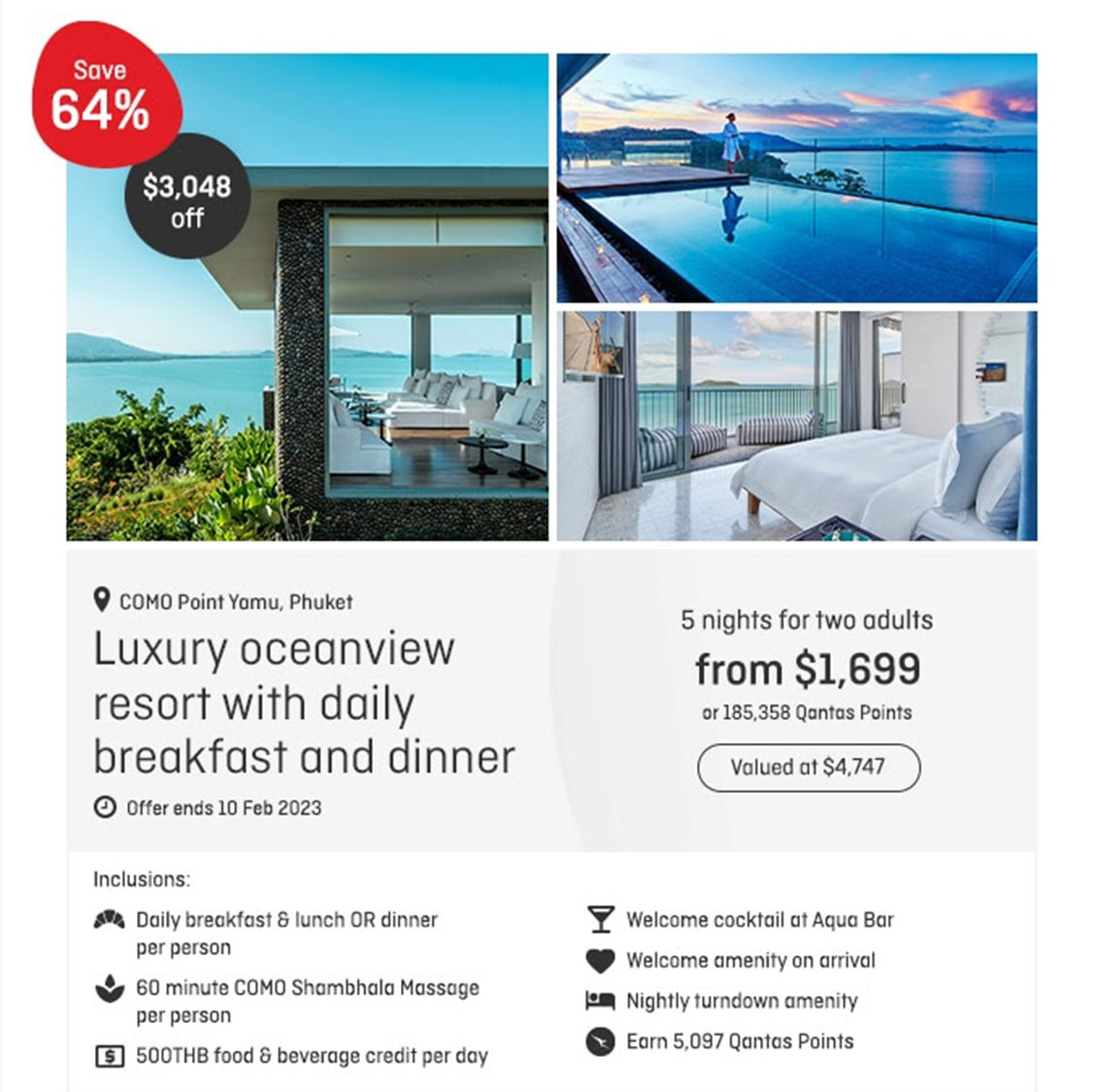 Accommodation and packages that are currently listed online are available across many of Qantas Holidays’ network of destinations, domestically and internationally, and include luxury hospitality brands such as InterContinental Hayman Island Resort, Four Seasons Hotel Sydney, Jumeirah Bali, COMO Point Yamu in Phuket, as well as numerous QT Hotels and Crystalbrook locations, and others.