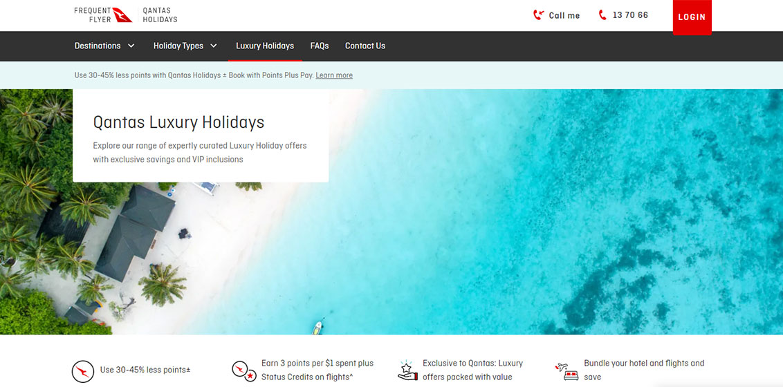 Frequent Flyers will earn 3 Qantas Points per $1 spent on accommodation, plus Status Credits on packages including flights, when booked through Qantas Luxury Holidays.