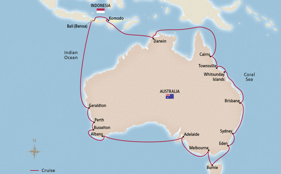 The Grand Australia Circumnavigation will operate roundtrip from Sydney counterclockwise, visiting ports including Airlie Beach, Townsville, Cairns, before a side trip to Indonesia, stopping in Komodo and Bali, then to Geraldton, Albany, Adelaide, Burnie and Eden.