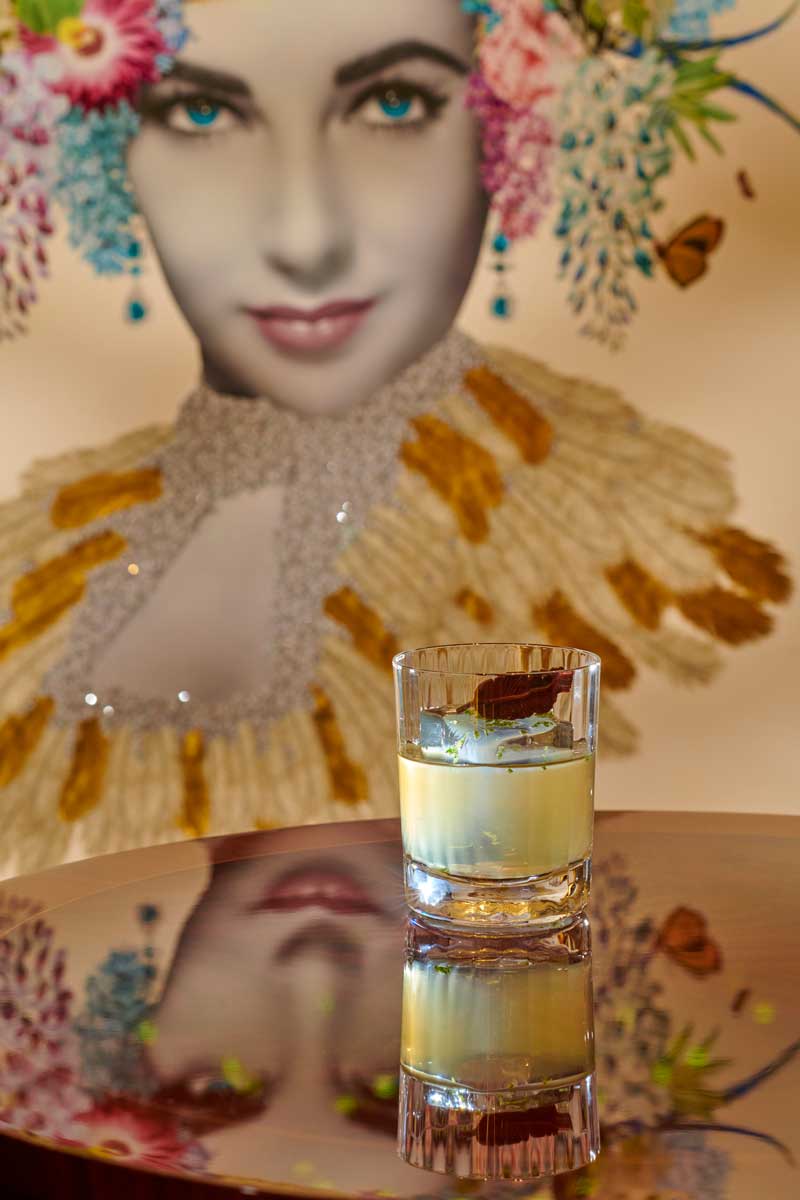 Petal Head is inspired by Amy Judd’s whimsical florals created with Stoli Elit, kumquat, Aperol, and passion fruit; and Stamp Duty, which references Ann Carrington’s iridescent of the Queen Elizabeth II postage stamp, features Doorly’s 3 Barbados rum, Drambuie, Oloroso sherry, lime and homemade English breakfast tea butter syrup. Gilded Sun draws on the gold leaf and deliate tones of Sue Arrowsmith’s artwork, whilst Velvet Brown pays tribute to Maria Rivas’ elaborate collage of Elizabeth Taylor and The Dorchester with more exotic flavours. Moreover, Time Remembered mimics Melanie Goemans’ painting by incorporating carefully selected herbs and fruit, whilst Ewan Eason’s map of London forms the basis of the City of Gold cocktail with the use of gold dust and lemon verbena cordial.