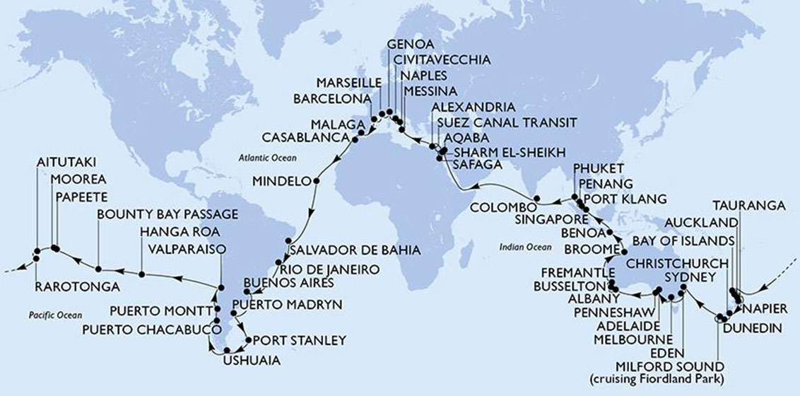 The 116-night voyage around the world will visit 50 destinations in 21 countries, with seven overnight stays, including 22 destinations that have never featured on an MSC World Cruise before.