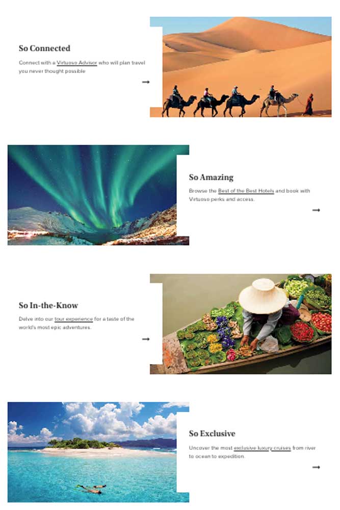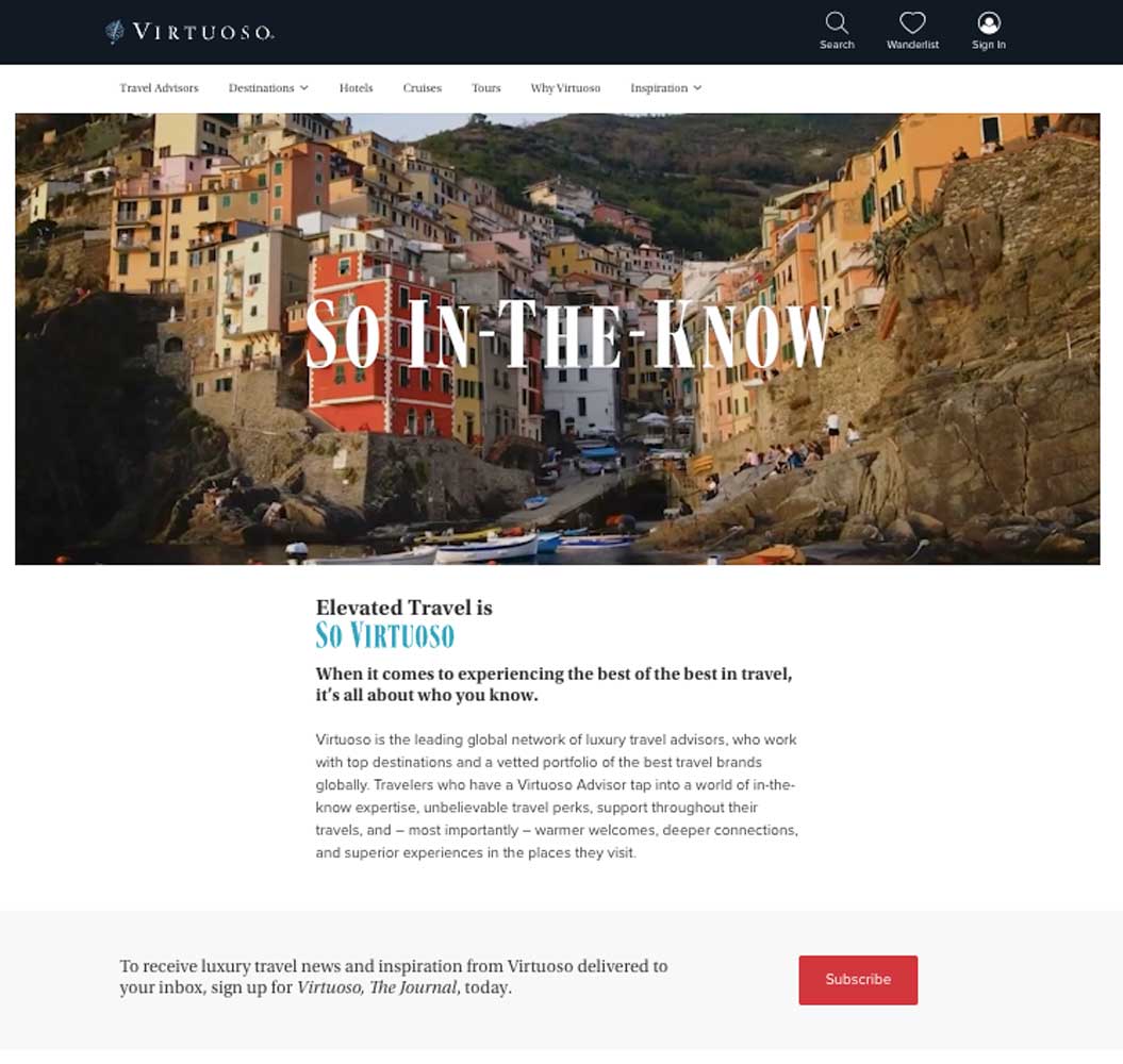 Previously, Virtuoso’s portal was used to locate an advisor and primarily to inspire prospective travellers with rich content – the goal of which was to guide them through the path to purchase by finding them an advisor.