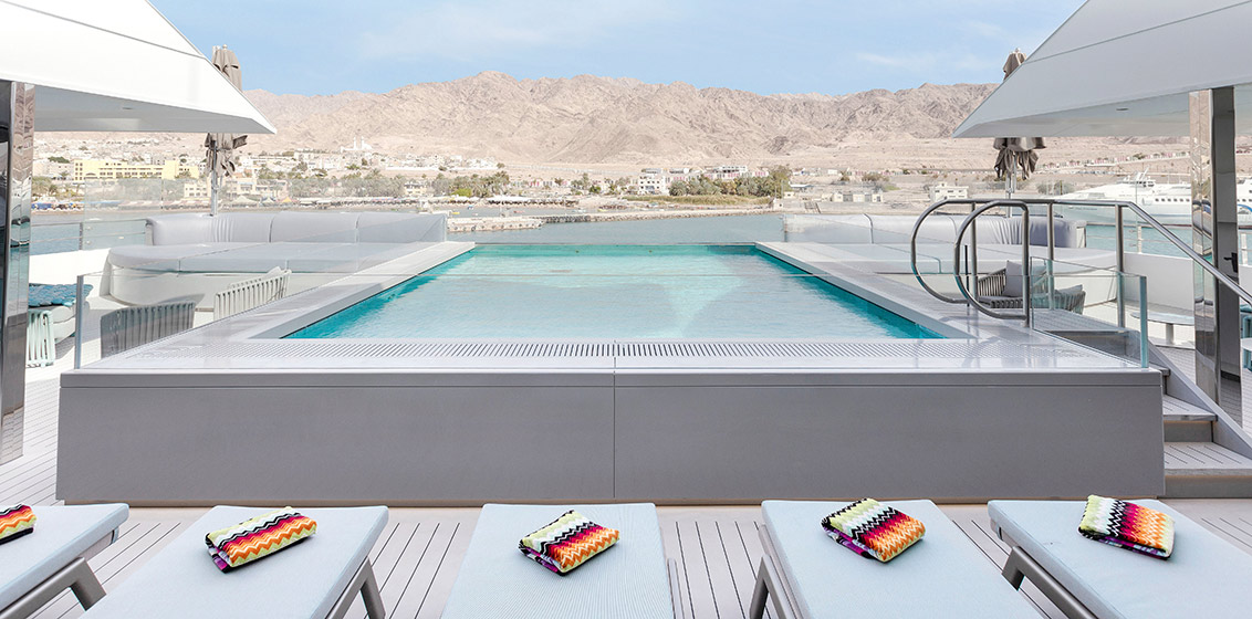 On board, Emerald Sakara’s Wellness Centre comes complete with a spa, gym and state-of-the-art infrared sauna for the ultimate indulgence, while its Sky Bar, infinity pool and comfortable public areas are perfect to relax and watch the world go by. The yacht’s marina platform is designed for watersports.