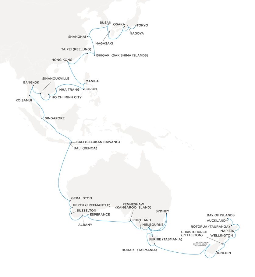The journey begins by exploring multiple ports in New Zealand and Australia before venturing to Bali, Singapore, the Philippines and beyond. With overnights in Melbourne, Bangkok, Ho Chi Minh City, Shanghai and Osaka, guests will have ample time to immerse themselves in a unique variety of new and familiar cultures, indulge in local delicacies and create memories to last a lifetime.