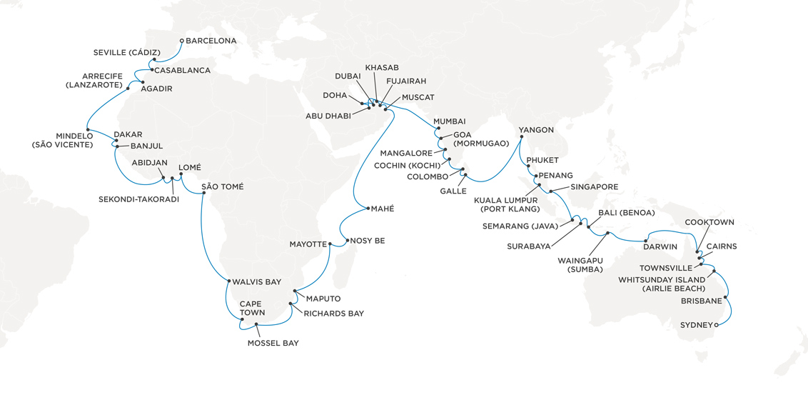 As part of the Grand Continental Sojourn, embark on an enchanting 84-night journey from Barcelona to Sydney aboard the luxurious Seven Seas Navigator. Tour Morocco and the Canary Islands before cruising the western coast of Africa to Cape Town. New adventures await at every port of call as the ship sails to Madagascar and the Seychelles, Oman and Qatar, India and Sri Lanka and beyond.